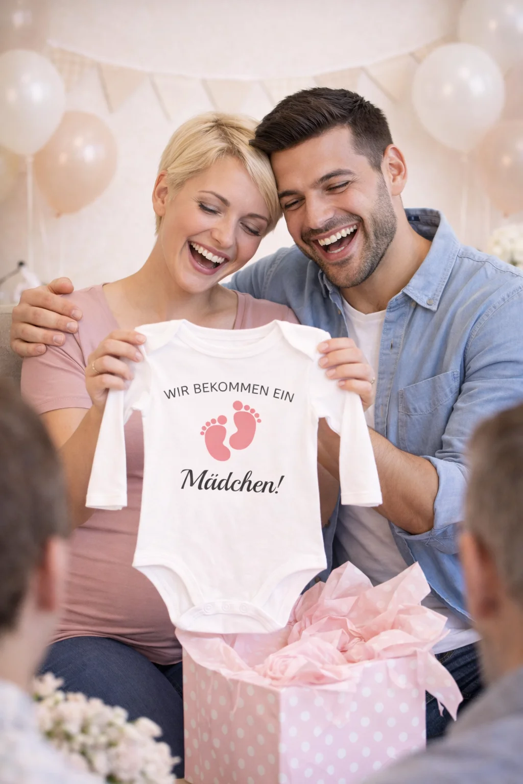 Wir bekommen ein Mädchen! Teilt eure Freude mit der ganzen Familie. Dieser liebevoll gestaltete Baby-Body ist das perfekte Outfit für die große Verkündung – ob auf dem Familienfoto, beim Besuch bei Oma und Opa oder als Überraschungsgeschenk.