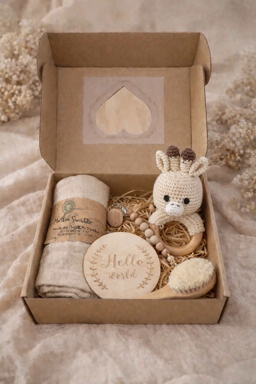 Dieses Geschenkset macht den ersten Tag unvergesslich. Das gravierte Holzschild „Hello World“ ist der perfekte Begleiter für die ersten Neugeborenenfotos – und bleibt danach als Kinderzimmerdeko. Die weiche Musselin-Schmusetuch (70 % Bambus & 30 % Baumwolle) schmiegt sich sanft an empfindliche Babyhaut. Der Giraffen-Greifling mit Holzring und die Schnullerkette aus Naturholzperlen sind vom ersten Tag an in Gebrauch. Die Babybürste mit weichen Borsten rundet das Set ab.