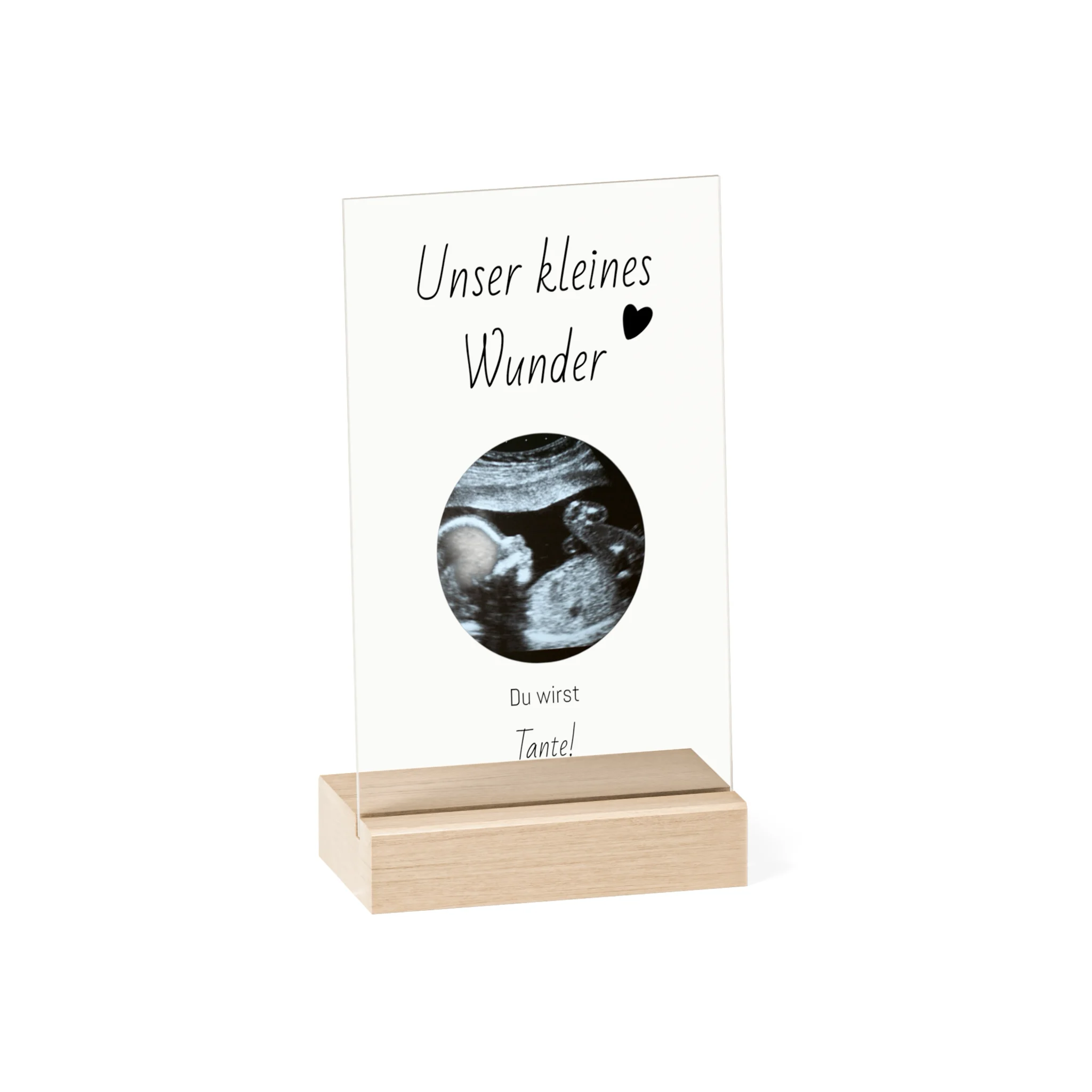 Dieses personalisierte Acrylschild macht die Schwangerschaftsverkündung zu einem ganz besonderen Moment. In einem ruhigen, modernen Design vereint es den liebevollen Schriftzug „Unser kleines Wunder“ mit einem Herzdetail und einem individuell integrierbaren Ultraschallbild. Die Botschaft „Ihr werdet Tante & Onkel“ sorgt für einen emotionalen Überraschungsmoment, der lange in Erinnerung bleibt. Das transparente Acryl verleiht dem Motiv eine leichte, schwebende Optik, während der natürliche Holzfuß für Wärme und einen stilvollen Stand sorgt – ideal als Geschenk oder liebevolle Deko für Zuhause.