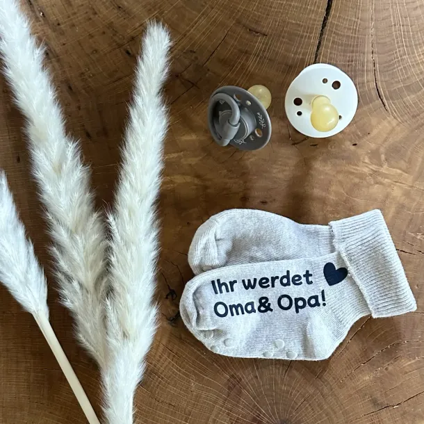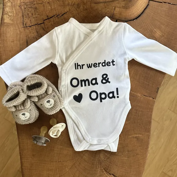 Ein liebevoll gestalteter Babybody mit dem Aufdruck „Ihr werdet Großeltern“, ergänzt durch Babysocken oder ein kleines Accessoire, ist eine schöne Überraschung für werdende Großeltern. Alternativ bieten sich auch passende Produkte aus der Kategorie Geschenke für Neugeborene