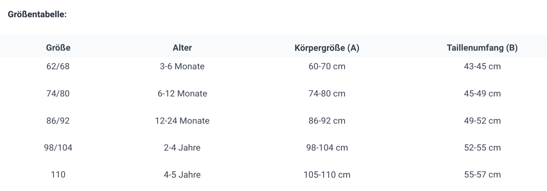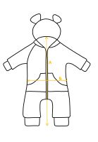 Wir empfehlen, eine Nummer größer zu wählen als die aktuelle Kleidergröße Ihres Kindes. So hat Ihr Kind genügend Bewegungsfreiheit und der Overall kann länger mitwachsen. Achten Sie darauf, dass die Ärmel- und Beinlänge ausreichend ist.
